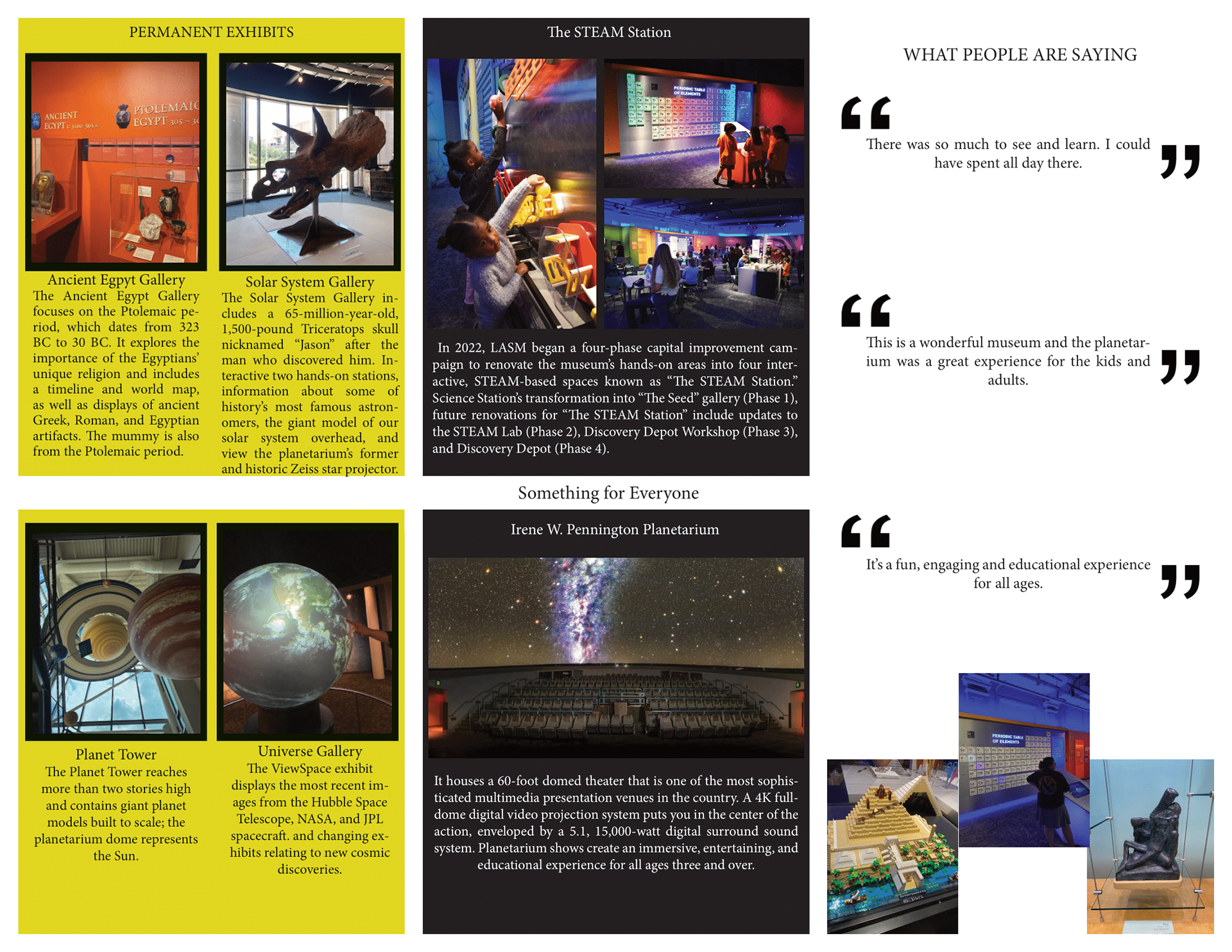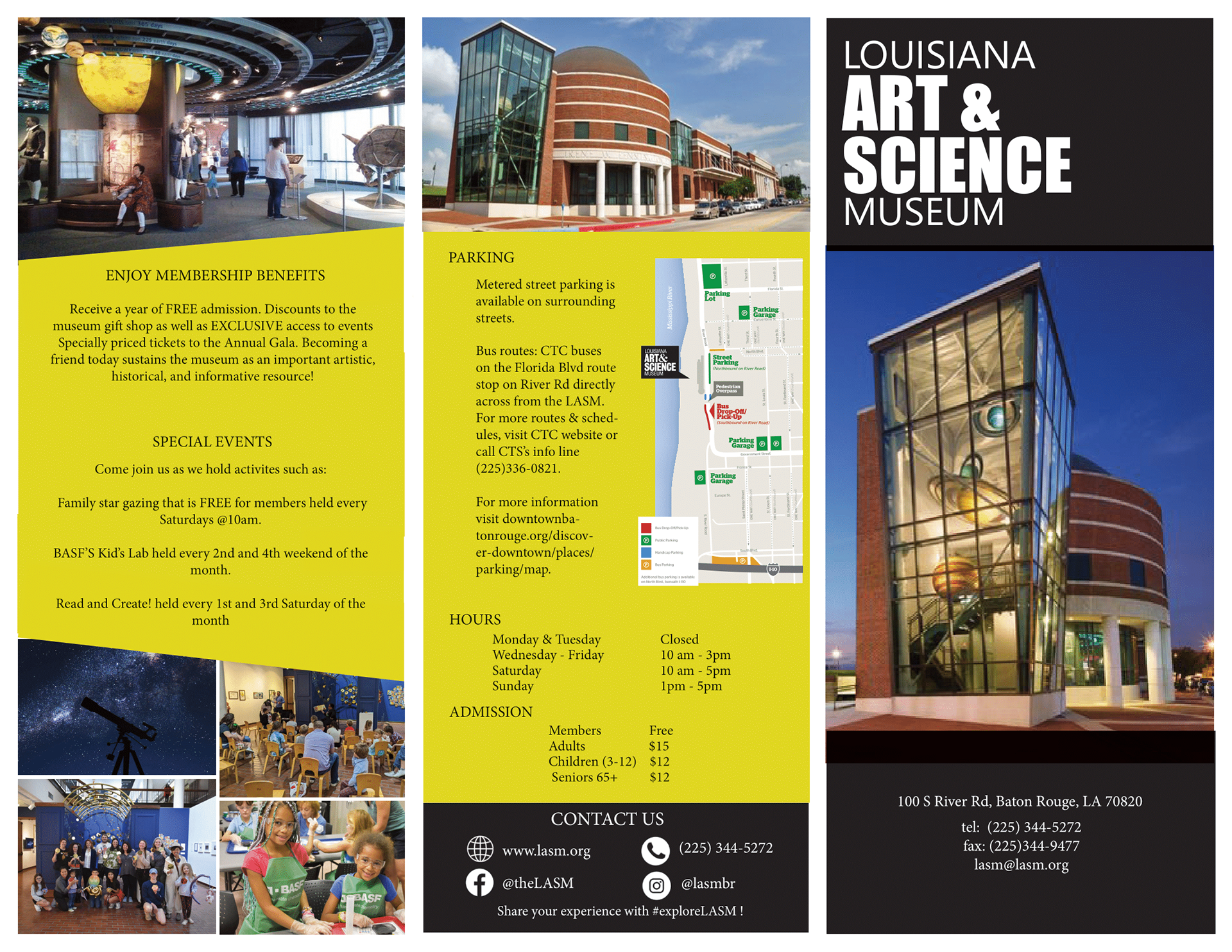 Mock of a newly updated brochure for Louisiana Art and Science Museum to help the incoming crowd of people navigate the museum and Information on its popular exhibits.
